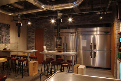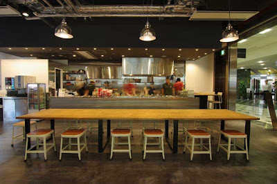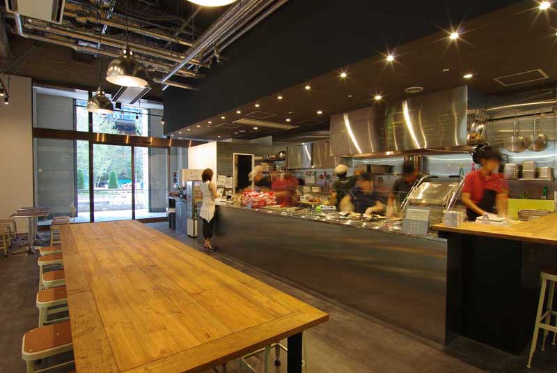 ステンレスのカウンター、LYONのスツール等、デザインはこれまでの3店舗のイメージを踏襲していますが、ここまで天井高がある店は初めてです。