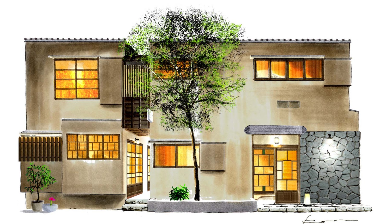 最終的に変更した個所もありますが、両店舗の外装イメージスケッチです。